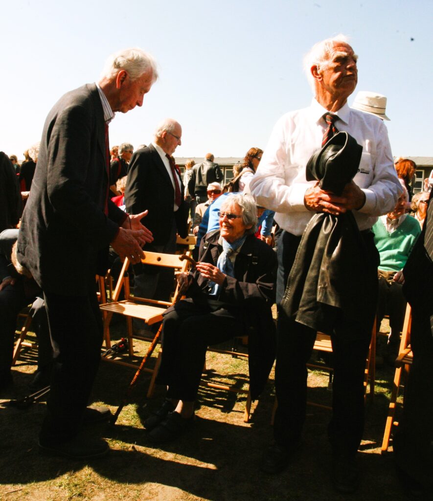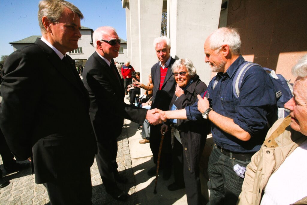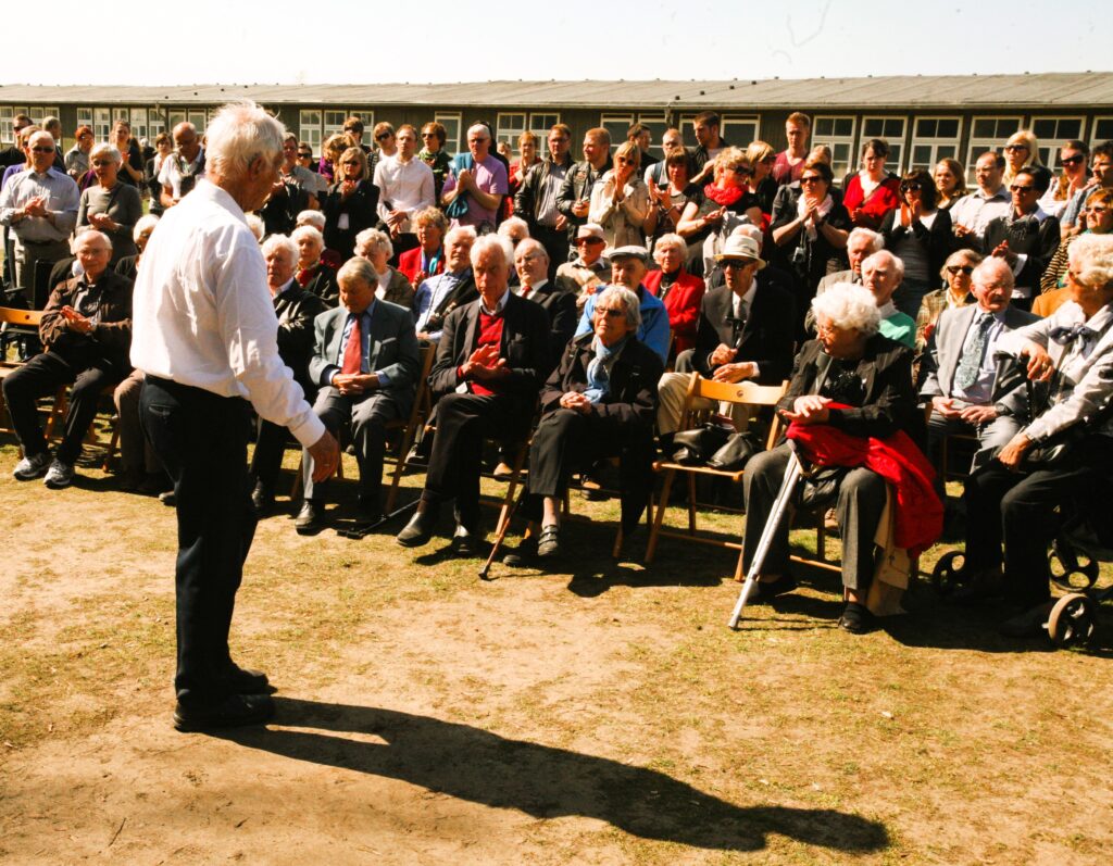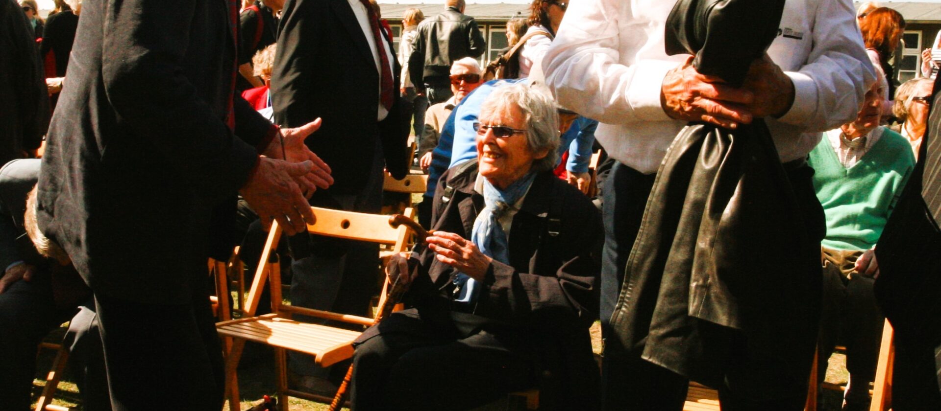 OMGITT av veteraner: Wanda sitter på tilhørerbenken i Sachsenhausen, mens Sigurd Syvertsen (1921-2016) holder en sterk minnetale. Foto: Asbjørn Svarstad