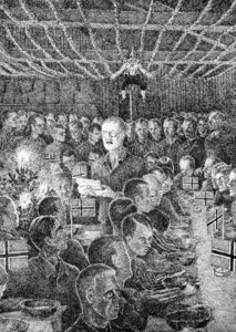 SISTE JUL i Sachsenhausen. Arnulf Øverland leser dikt for sine fangekamerater. Tegning: Odd Nansen